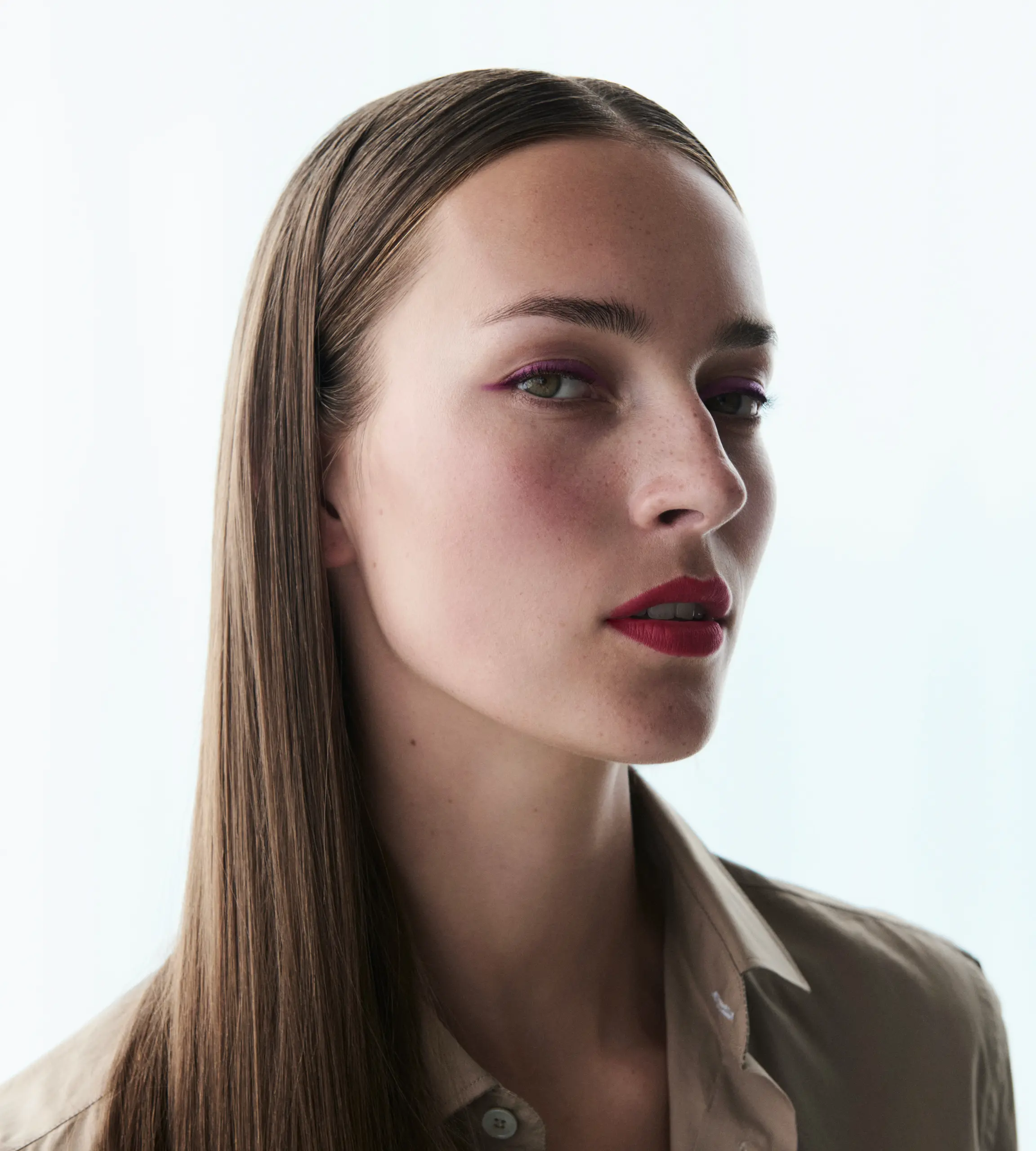 Selbstbewusste Modernität in ausdrucksvollem Rot! Matt und präzise setzt der Sensual Lipstick Scarlet den Mund in den Fokus. Ein Ausdruck purer Präsenz, den der Automatic Pencil for Eyes Cranberry in einer klaren Linie am Lidrand entlang fortsetzt. Der sehr natürlich gehaltene Teint unterstreicht den kraftvollen Minimalismus des Looks.